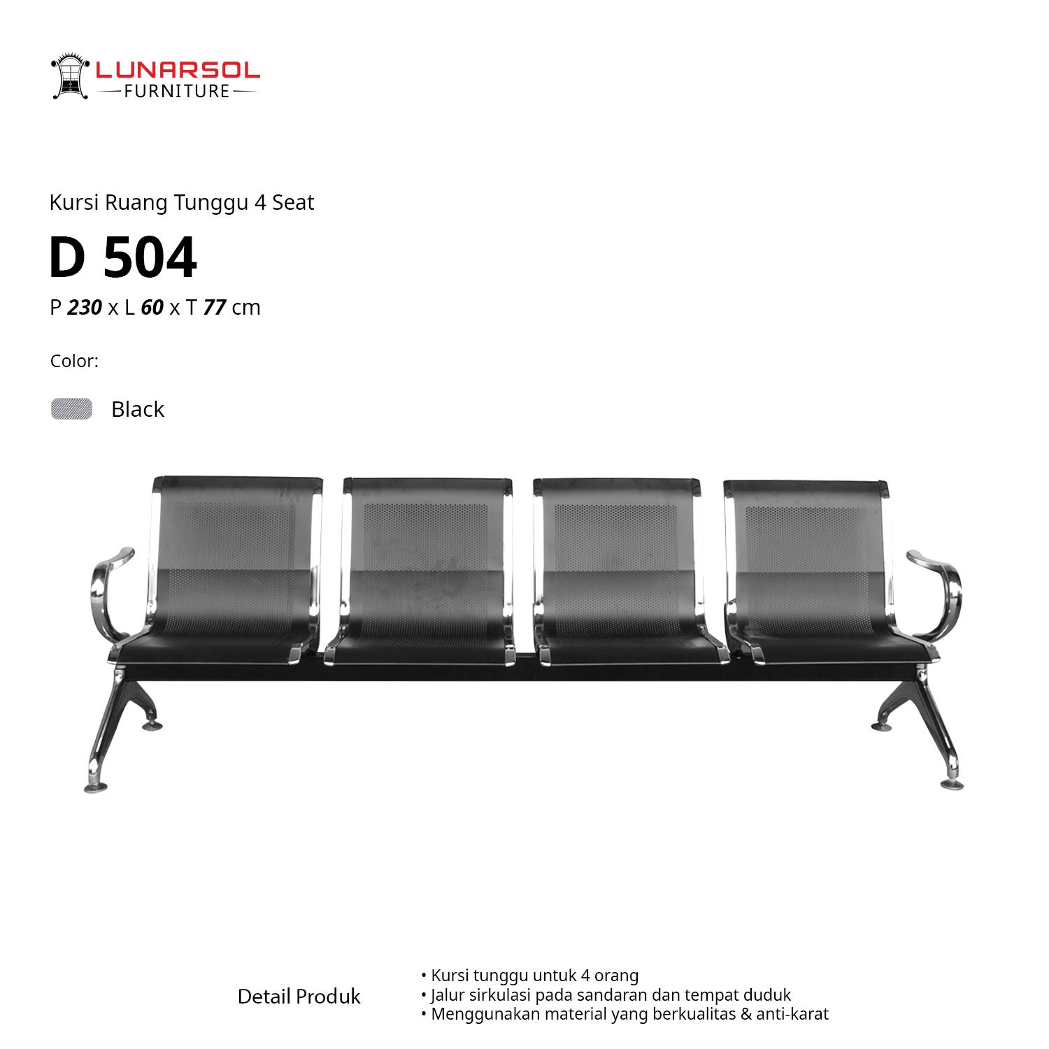 Kursi Tunggu D504 adalah solusi elegan dan nyaman untuk berbagai kebutuhan, baik di bandara, klinik, maupun ruang tunggu lainnya. Dengan desain modern dan bahan berkualitas tinggi, kursi ini memadukan besi dengan powder coating serta chrome plating, memberikan tampilan yang mewah dan tahan lama. Kursi ini memiliki empat tempat duduk, menjadikannya pilihan ideal untuk mengakomodasi lebih banyak orang dalam satu baris. Dengan ukuran 230 x 50 x 77 cm, Kursi Tunggu D504 dirancang untuk memberikan kenyamanan optimal sambil menambah estetika ruangan Anda.